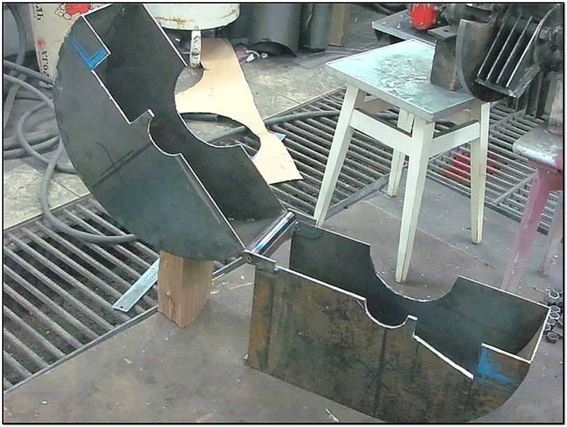 - Для защитного кожуха и подающего рукава пойдет листовое железо толщиной около 12 мм, которое нужно нарезать, а потом сварить из полученной «выкройки» корпус.