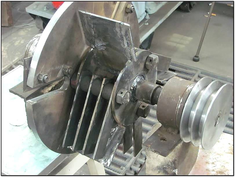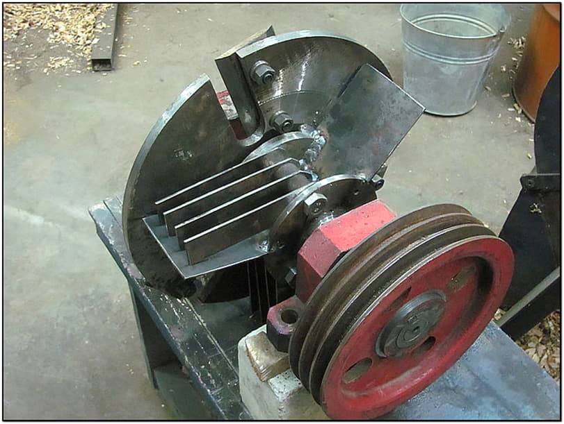Первым делом на вал ставим подшипники, диск с ножами и молотки, рубильный блок готов. Вырезаем отверстия в корпусе для установки рабочего вала, приемного бункера и выгрузки щепок. Просверливаем отверстия под сборочные болты и привариваем воронку приемного бункера. На раме крепим электродвигатель, устанавливаем шкивы и накидываем ремень. Закрепляем рубильный блок на раме и закрываем его защитных кожухом. Пробуем запустить готовый щепорез в холостую.