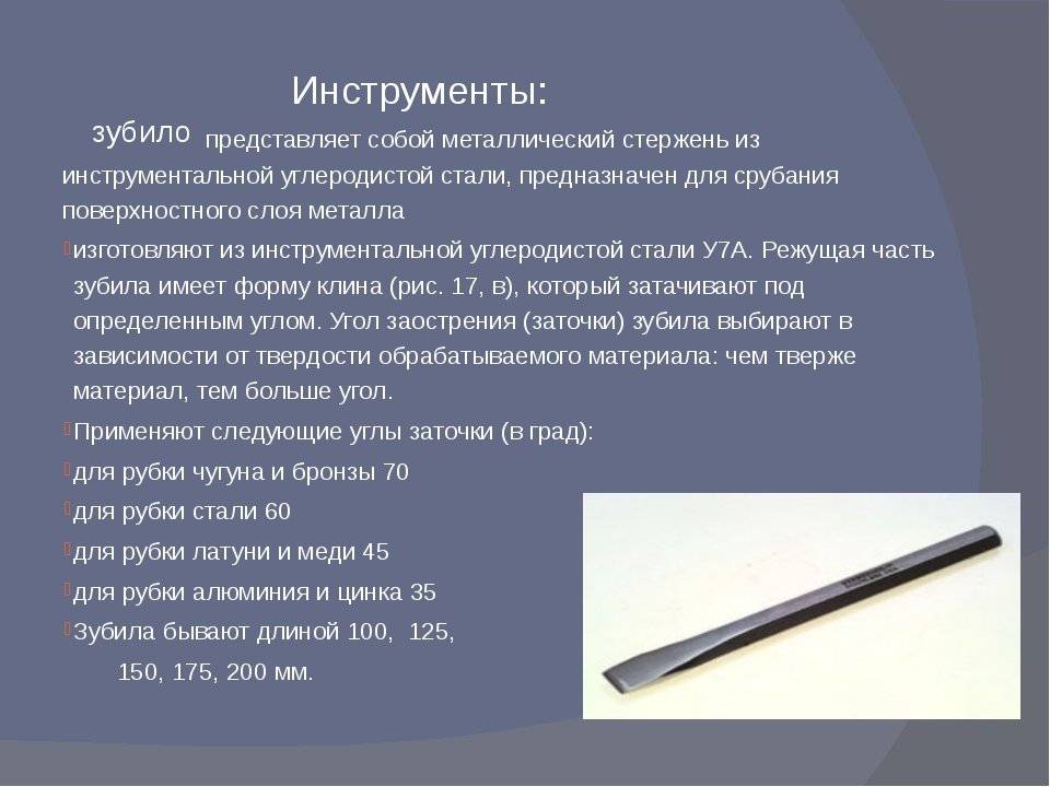 На рисунке показана режущая кромка с углом заострения α. Угол α выбирается из ряда 35°, 45°, 60°, 70° в зависимости от условий работы инструмента Зубило представляет собой, в большинстве случаев, продолговатый стержень, в сечении имеющий прямоугольную, круглую, овальную или многогранную форму. Зубило затачивается с одного конца (рабочая часть), а другой конец его тела (затыльник) предназначен для ударов молотком. Для обеспечения безопасной работы и защиты рук от случайных ударов молотка, на тело зубила может надеваться «грибок» — полая рукоятка с бортиком, выполненная из резины, дерева, пластмассы или металла. Рабочая часть зубила имеет двухстороннюю заточку с главным и вспомогательным углами резания; для повышения стойкости режущая кромка слегка затуплена. Хвостовик и рабочая часть зубила обязательно подвергается термоулучшению.