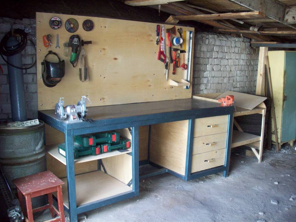 Помимо столешницы, здесь могут присутствовать многослойные конструкции полок и подвесных емкостей для хранения гвоздей, шурупов и гаек.