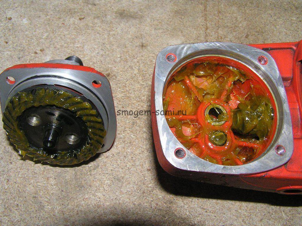 Чтобы убедиться в необходимости внесения нового объема смазки, редуктор требуется разобрать, выкрутив на его крышке винты. Внутри находится пара косозубых шестеренок.