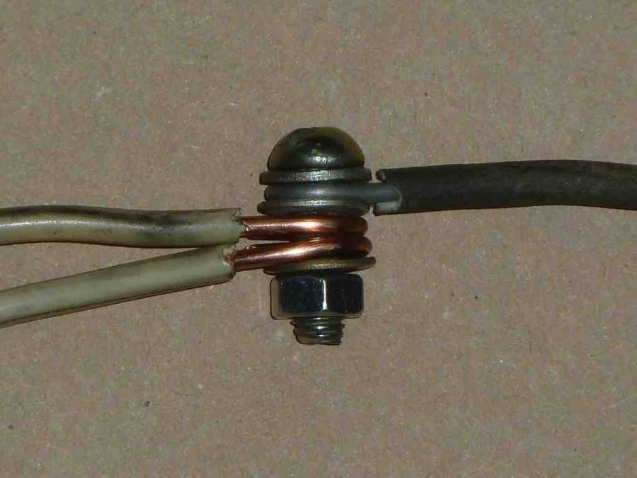 Жилы проводов необходимо зачистить и кончики скрутить в виде колечек. На болт надевается стальная шайба, далее накидываются колечки соединяемых проводов (это в том случае, когда они из однородного металла), потом следует ещё одна стальная шайба и всё закручивается гайкой. В случае если выполняется подключение алюминиевого и медного проводов, между ними необходимо расположить ещё одну дополнительную шайбу.