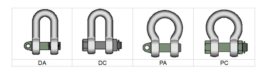 В качестве силовых соединений в такелаже используются такелажные скобы. Они бывают разной формы: U-образная (тип D) и Ώ-образная (тип P), а в качестве запирающего элемента используют либо винт (тип A), либо болт с гайкой и шплинтом (тип C).