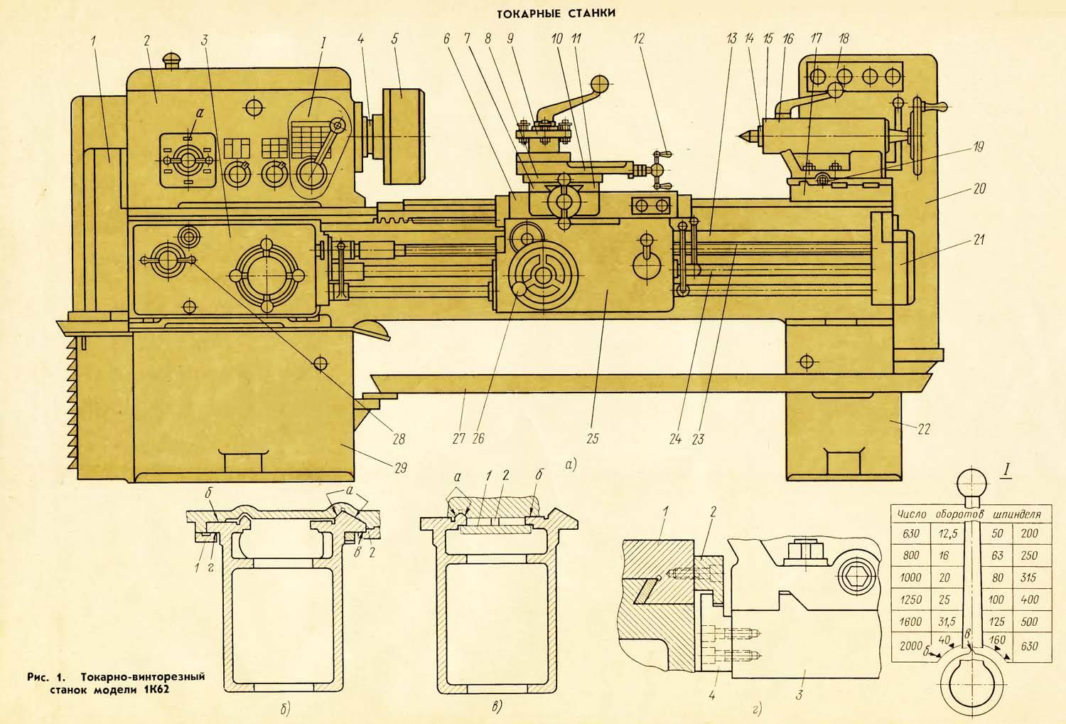 Основные узлы станка: станина 13, которая служит для соединения между собой всех узлов станка; передняя бабка 2, в которой помещены шпиндель 4 станка и коробка скоростей; суппорт 11, на котором закрепляется режущий инструмент; задняя бабка 15; коробка подач 3, передающая вращение ходовому валику 24 и ходовому винту 23; шкаф 20 с электрооборудованием станка; тумбы 22 и 29.