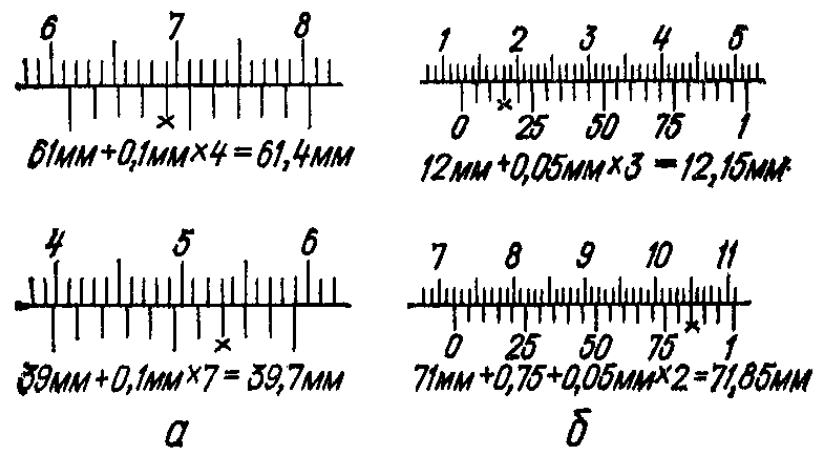 Рис. 2. Примеры отсчета показаний по нониусам штангенинструментов.