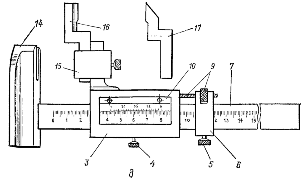 Рис. 1. Штангенциркули (а-в), штангенглубиномер (г), штангенрейсмас (д): 1 — губки для наружных и внутренних измерений; 2 — губки для наружных измерений и разметки; 3 — рамка; 4 — стопорный винт для зажима рамки; 5 — стопорный винт для зажима рамки микрометрической подачи; 6 — рамка микрометрической подачи; 7 — штанга; 8 — шкала штанги; 9 — гайка и винт микрометрической подачи; 10 — нониус; 11 — губки для наружных измерений; 12 — губки для внутренних измерений; 13 — линейка глубиномера; 14 —- основание; 15 — хомутик; 16 — измерительная ножка; 17 — разметочная ножка.