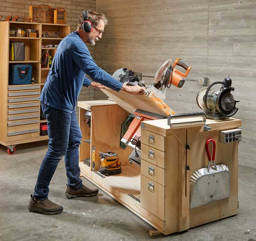 Готовый столярный верстак с поворотной столешницей и ящиками. Далее нужно установить на верстак своими руками столярный инструмент. В процессе монтажа электрооборудования на откидную крышку обязательно нужно сохранять баланс. Нельзя нагружать только одну сторону или один угол верстака. Установочные винты заглубляются минимум на 2/3 толщины в поворотной части столешницы. Это позволяет достигнуть надежной фиксации, ведь столярное электрооборудование имеет немалый вес. На боковых участках, где рабочая зона сохраняет стационарное положение, этот крепеж может проходить через всю толщину крышки.