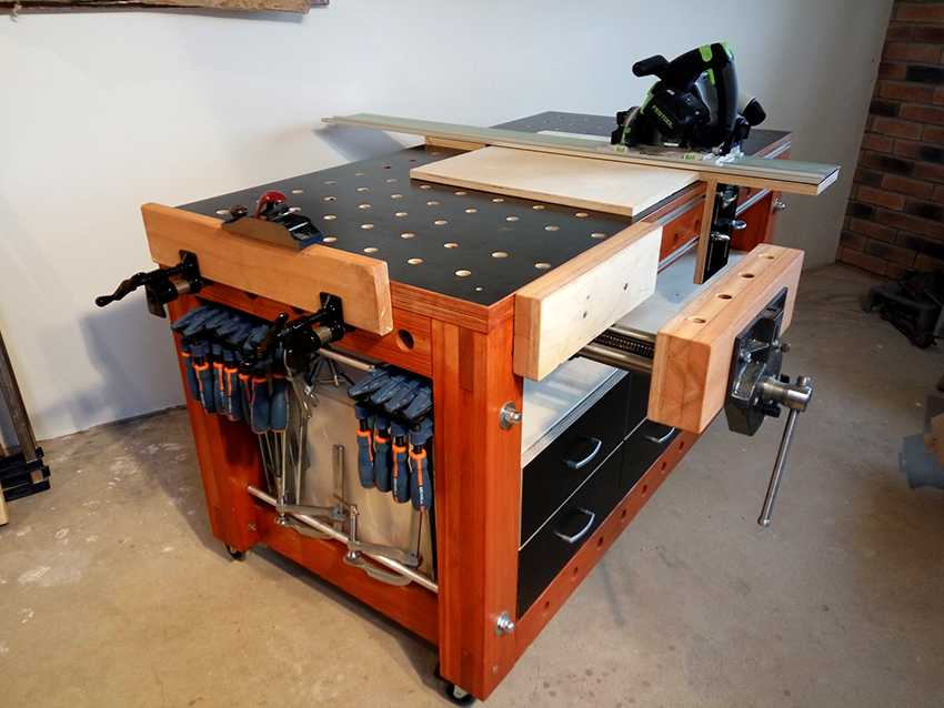 по данному верстаку есть план-схема с чертежами. Ниже американский вариант современного столярного верстака — рабочего стола.