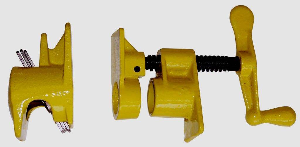 - Для больших изделий и щитовых конструкций используют трубные струбцины. В их состав входит полдюймовая или трёхчетвертная труба, упор и передвижная губка с фиксатором. Это недорогое изделие с большой прижимной силой. При необходимости такое приспособление изготавливается самостоятельно.