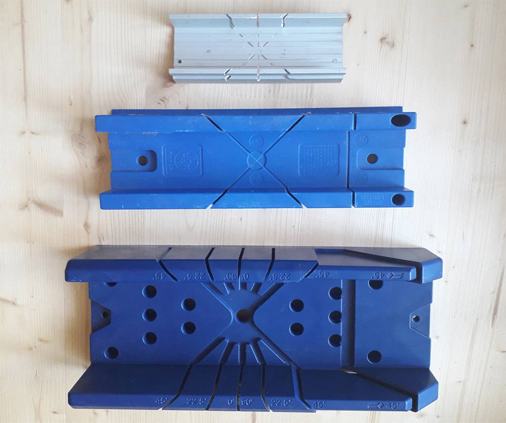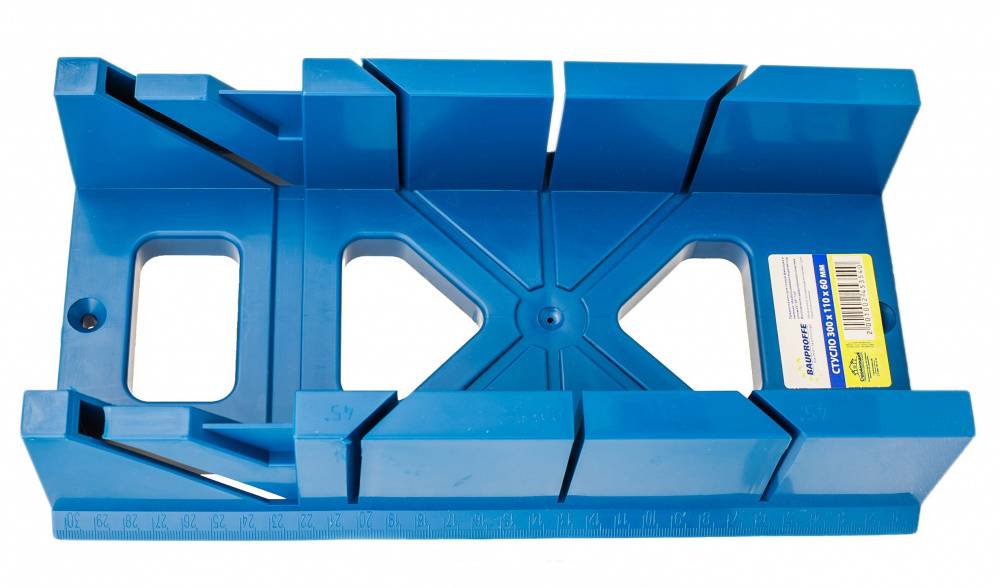 простое – наиболее востребованная модификация представляет собой форму промышленного или самостоятельного изготовления, чаще всего пластиковую, с несколькими боковыми прорезями, которые служат направляющими для пилы. Предназначается для распиливания реек, брусков, уголков из дерева, гипсокартона и прочих материалов под углами 45 или 90°;