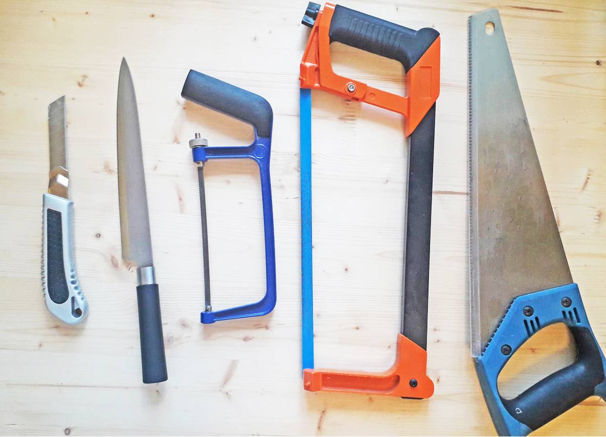 Монтажный нож поможет отрезать пенопласт, а для древесины необходимо взять ножовку с мелкими зубьями.