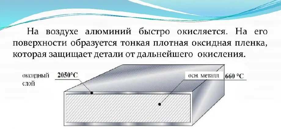 Алюминий и его сплавы образуют на поверхности тугоплавкую окисную пленку. Так, если сам металл плавится уже при 660°C, то покрытие – свыше 2000°C.