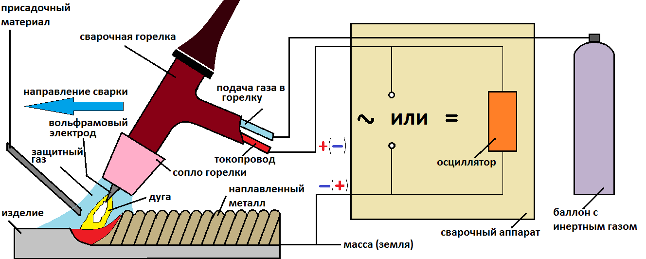 В отличие от обычного сварочного аппарата, при аргоновой сварке электрод не вставляется в держатель, а подносится непосредственно в пламя аргоновой горелки. Сам процесс больше напоминает пайку, чем сварку: разогреваются свариваемые поверхности, и между ними заливается расплавленный металл. Это описание сварки как процесса в общих чертах. Ничего сложного, поэтому справиться с такой работой может каждый, имеющий опыт сварочных работ. А для осуществления этой процедуры вам потребуется:
