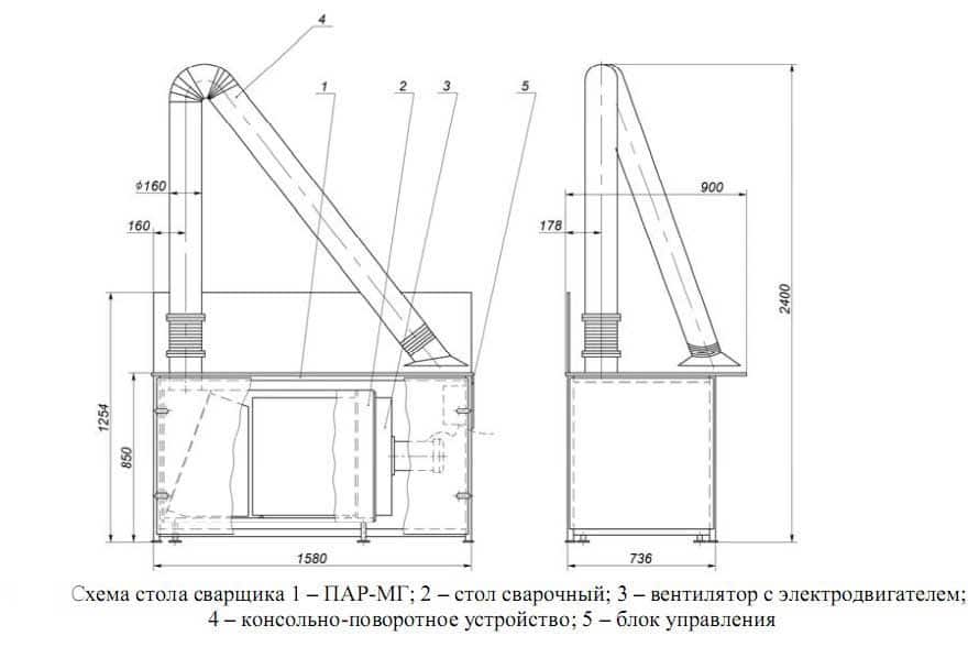 - вентилирующее устройство смонтировано на высоте 1,3–1,5 м над сварочным верстаком;