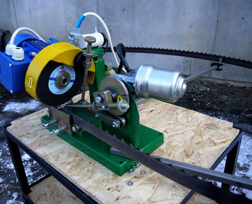 После выполнения разводки инструмент обрабатывают на станке для заточки пил подобного типа. Основной элемент станков (круги) должен соответствовать материалу, из которого выполнена ленточная пила. Для биметаллических вариантов подойдет боразоновый или алмазный абразив. Для пил из инструментальной стали вполне достаточно корундового обтачного круга.