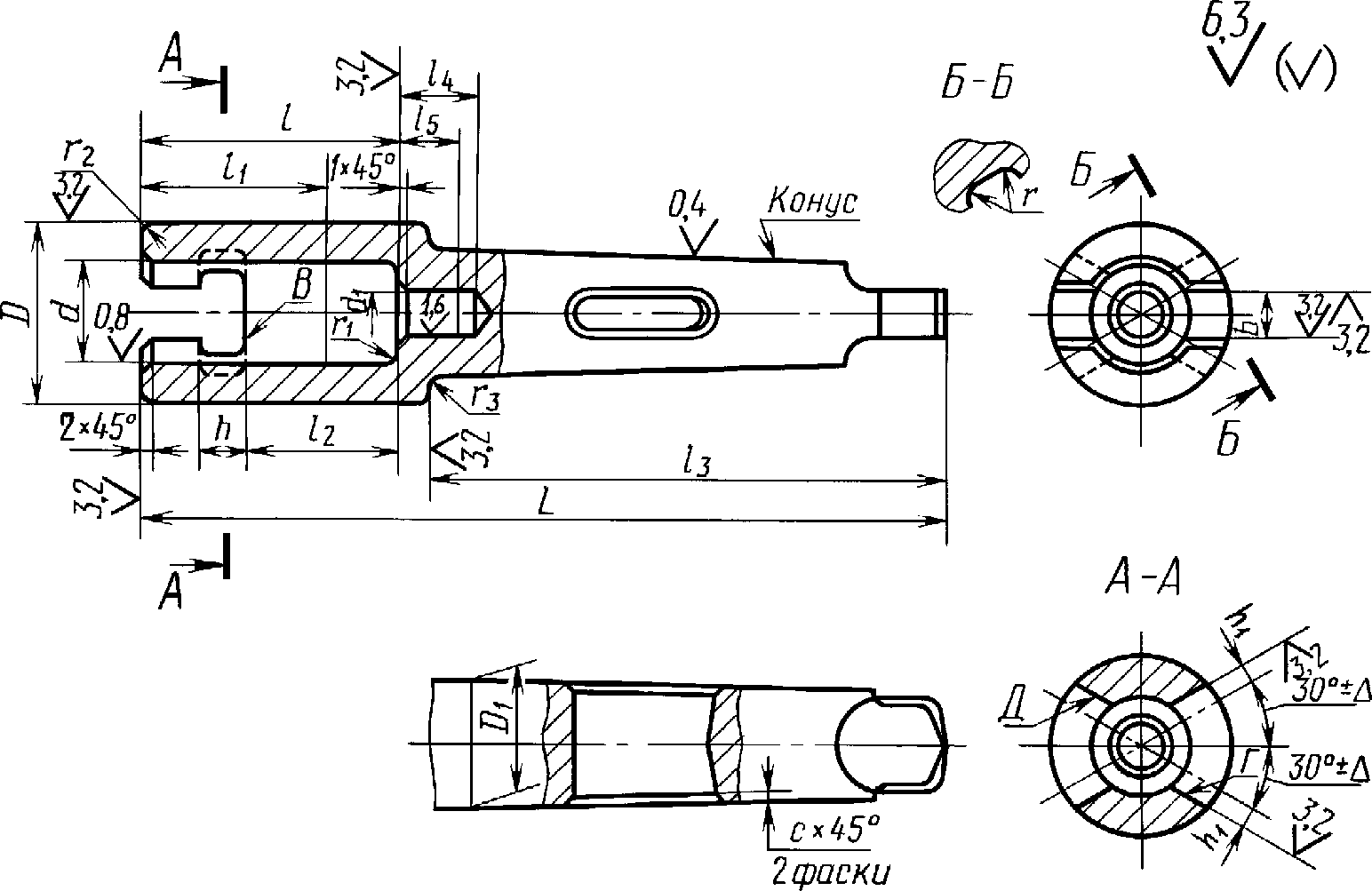 | Примечания 1 Размеры, заключенные в круглые скобки, — для станков, спроектированных до 01.07.94. 2 Размеры, заключенные в квадратные скобки, применять не рекомендуется. 3 Значения размеров , а также размеры фасок и винта (поз.2) являются рекомендуемыми. 4 Неуказанные размеры шпонки (поз.1) — по ГОСТ 12595. 5 Допускается изготовление концов шпинделей с резьбовыми отверстиями диаметром по табл.8 вместо цилиндрических отверстий и . 6 Допускается вместо фаски делать закругление радиусом . |