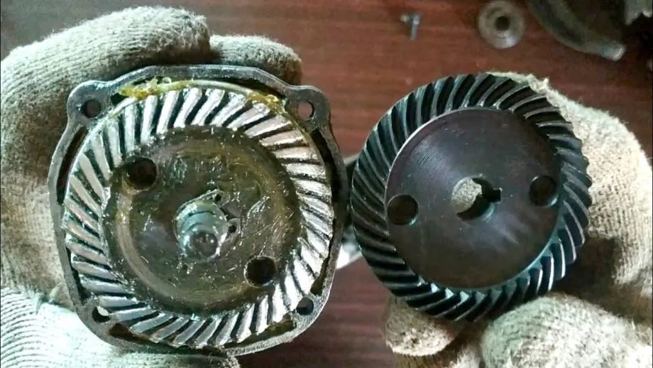У большинства угловых шлифмашин в редукторах применяются шестерни с гипоидным (кривозубым) зацеплением, повышающим плавность хода и снижающим уровень шума.