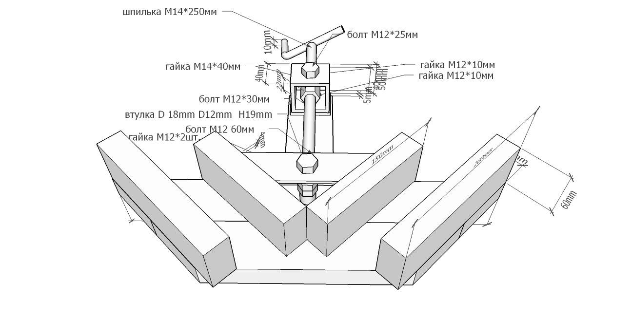 Изготовление основы. Стальные пластины и уголок такой же толщины свариваем по чертежам выбранного варианта. Главная задача — тщательно вымерять угол под 90 градусов для закрепления свариваемых деталей. Угол может быть и другим, если вы делаете инструмент для узконаправленной цели.