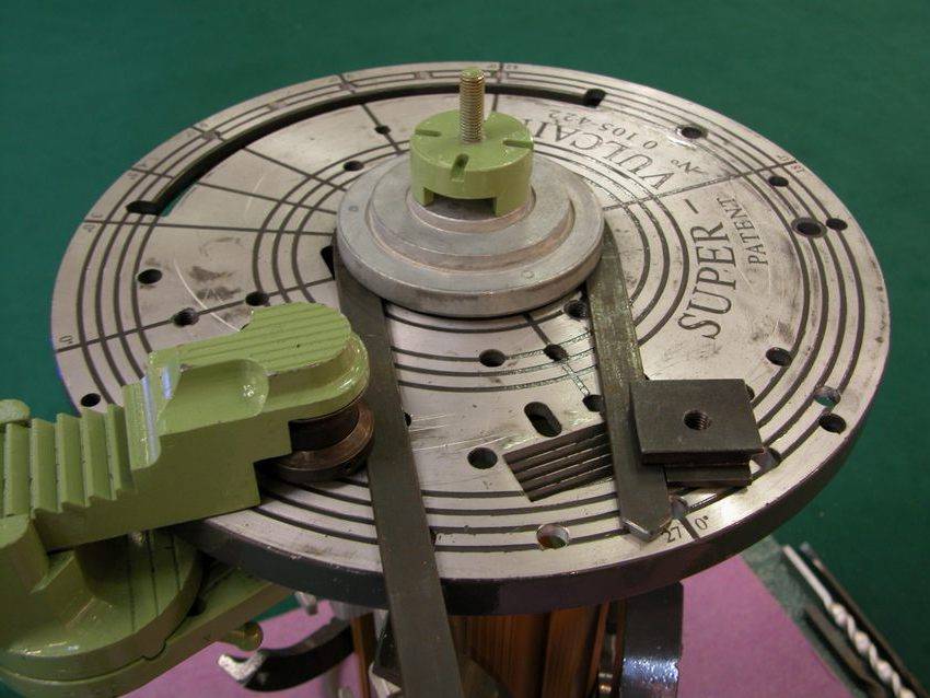 Конструкция гибочного станка также несложная, однако она содержит несколько обязательных элементов, сборка которых невозможна без специализированного инструмента. Основание – массивная металлическая пластина с пазом посередине, в который вставляется подвижный упор, перемещаемый червячным механизмом. Два других цилиндрических упора неподвижны и крепятся на основание с двух сторон симметрично относительно паза. Именно монтаж упоров может вызвать затруднение, так как отверстия под крепеж сверлятся только на специализированном станке, воздействию дрели такая заготовка из высокопрочной стали не поддастся.