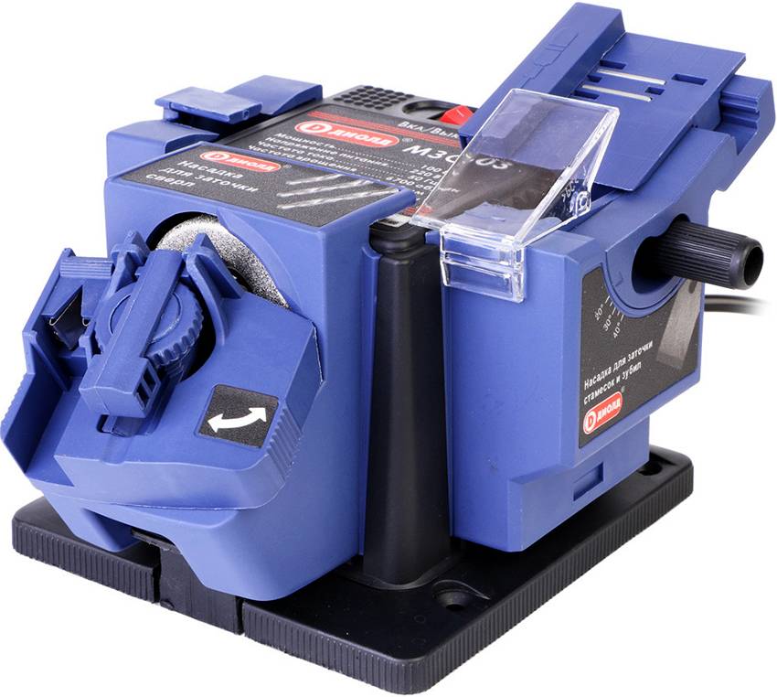 Ещё одно недорогое устройство, предназначенное для небольших изделий. Впрочем, при аккуратном использовании, не налегая, можно наточить и топор. Интегрированная подсветка на гибкой подставке пригождается всегда, а включением происходит вместе с запуском двигателя. Регулируемые площадки для выставления угла заточки не имеют делений, поэтому для нужного положения придётся воспользоваться шаблоном.