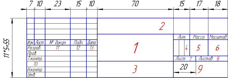 - Ширину основной надписи документов, получаемых на АЦПУ, допускается увеличивать или уменьшать за счет изменения размеров граф (граф 11, 16 и (или) 1, 2, 28, 30 – для конструкторских документов, а также граф 3 и 26 – для чертежей и схем).