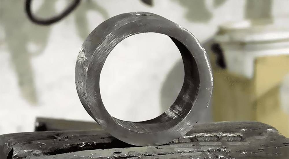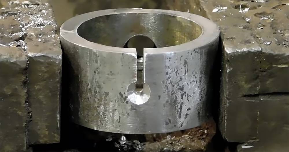 Сначала отрезаем кусок толстой трубы, её диаметр должен быть 57 мм, а длина 3,5 см. Далее высверливаем отверстие диаметром 12 мм. Как только высверлили отверстие в трубе, нужно приварить гайку под шпильку М12.