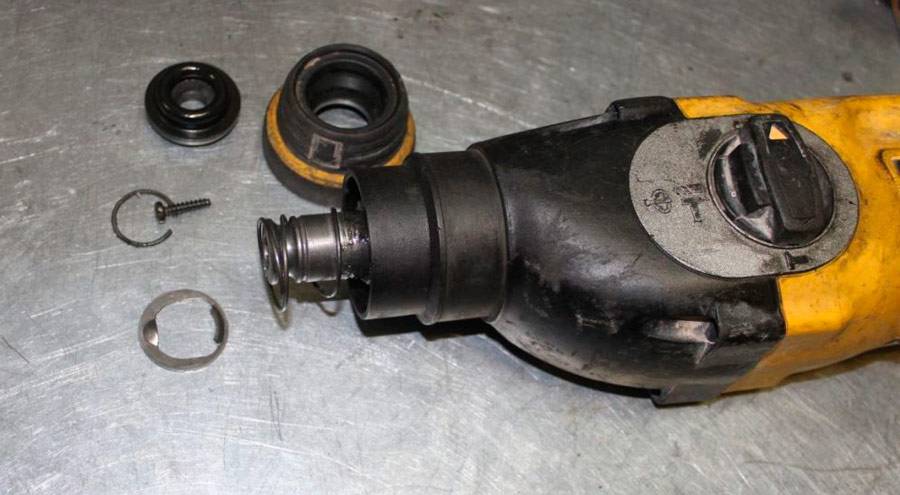 В некоторых случаях бывает такое, что заклинил бур перфораторе. Как правило, это происходит из-за использования дешевого инструмента низкого качества. В таких изделиях крепления не выдерживают нагрузки и деформируются. В некоторых случаях достаточно зажать инструмент в тиски и попытаться выкрутить его. В самых сложных случаях придется разбирать патрон. Для этого первым делом необходимо демонтировать верхнее резиновое изделие, а также стопорное кольцо, которое расположено под ним.